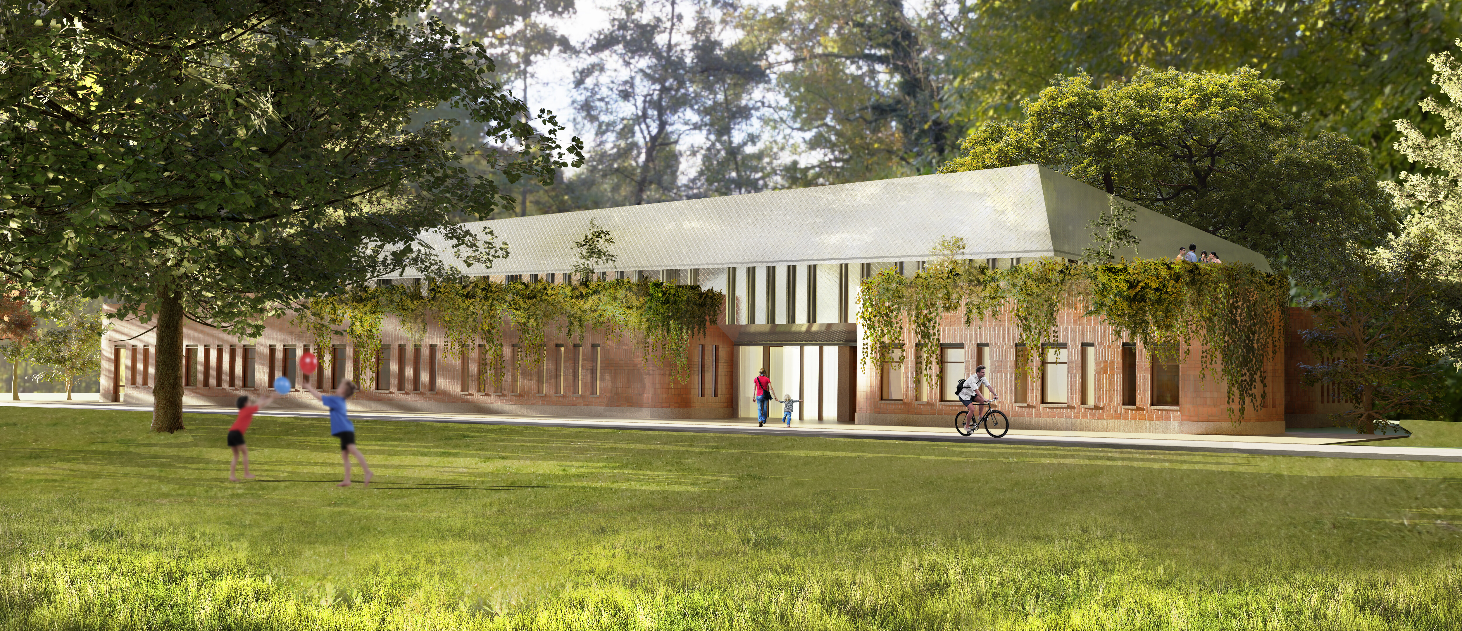 Tektonika formy i konktekst kulturowo-przestrzenny: Bryła zorientowana do planowanej drogi dojazdowej (ciągu pieszo-jezdnego) horyzontalną, frontową częścią. Tektonika bryły zainspirowana ceglaną tkanką Katowic rozbija się na wyspy funkcjonalne, które dodatkowo zostały zmiękczone, aby łagodnie wkomponować się w otaczający naturalny krajobraz. Część budynku powyżej parteru została wyodrębniona materiałowo i osadzona na ceglanych wyspach, tworząc podcienia. Wolne fragmenty brył parteru stworzyły zielone tarasy, służące strefom funkcjonalnym na piętrze: jako letnie sale do ćwiczeń.