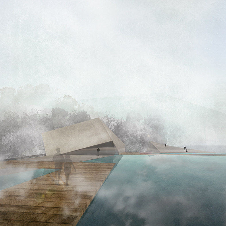 Tektonika formy i konktekst kulturowo-przestrzenny: Poprzez odpowiednie przekształcenie istniejącej struktury betonowego nabrzeża, powstał koncept połamanych bloków betonu, zachowujący historyczny element w zmienionej, ciekawej formie.